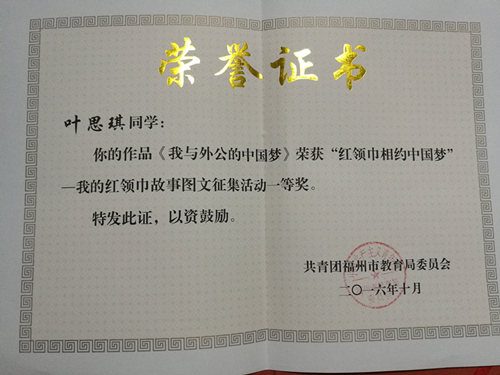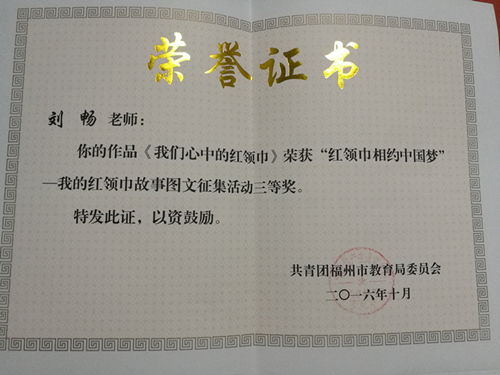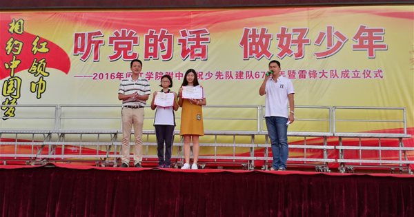 发表时间:2016-10-17 15:00作者:江如 根据福州市教育局的文件精神,为深入学习贯彻习近平总书记系列重要讲话精神,教育引导广大少先队员弘扬长征精神,珍惜来之不易的幸福生活,听党话、跟党走,培育和践行社会主义核心价值观,为实现中华民族伟大复兴的中国梦做好全面准备,在第67个中国少年先锋队建队日来临之际,我校大队部开展“红领巾相约中国梦”—我的红领巾故事图文征集活动,并选送优秀作品上报教育局,最终,我校初二(10)中队的叶思琦同学获得一等奖,刘畅老师获得三等奖,升旗仪式上,我校陈祁罕副校长为她们颁奖,希望今天有更多的队员老师参加此项活动。