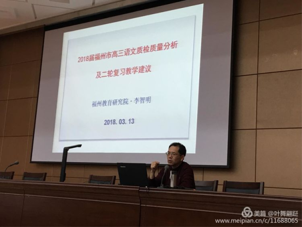 李智明老师针对两次质检出现的问题进行了全面细致分析,指出识记、论述类文本阅读、古代诗歌鉴赏依旧是薄弱项。会上智明老师对两次质检中成绩突出的学校进行了表扬,我校文科班在3月质检中进步显著也受到了表扬。