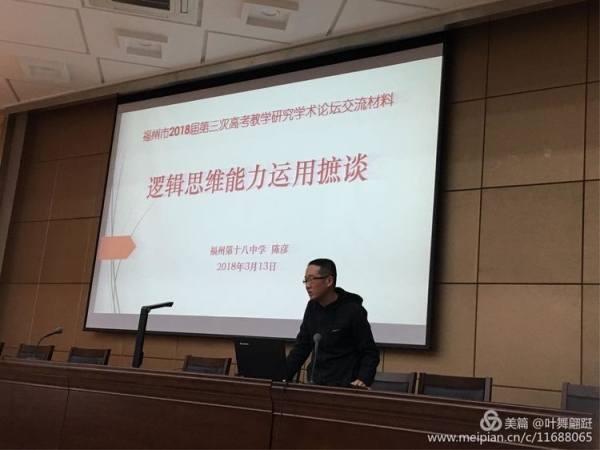 下午,福州第十八中学的陈彦老师针对高考逻辑推理题作了《高三复习逻辑思维运用摭谈》专题讲座,为高三老师提供了逻辑推理题的复习策略。