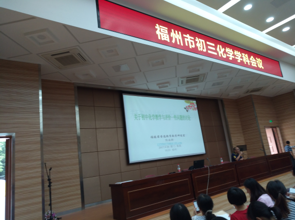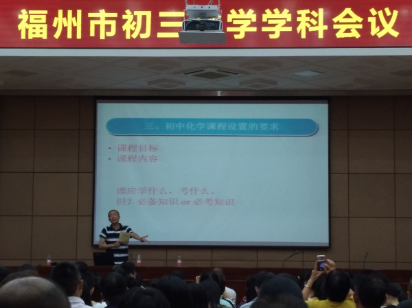 发表时间:2017-10-15 17:19作者:邱菊珍 2017年10月13日,福州市初三化学学科会议、初三化学教师岗位培训在我校正兴楼多功能厅举行,上午全市约400多名来自市区、各县市的毕业班化学教师聆听了福建省普通教育教学研究室陈启新老师的《关于初中化学教学与评价一些问题讨论》精彩讲座。陈启新老师从我省中考命题改革后遇到的问题、来自罗斯高的启示、初中化学课程设置的要求、高中选拔需要、个人一些思考等方面对2017年福建省中考化学试卷的命题特点、难易度等方面做了详尽的分析。下午福州市教育学院卢秉政老师也对2017年福建省中考化学试卷的命题特点、难易度、学生的答题情况、错误率等方面做了细致又全面的分析,指导老师们如何选择既有针对性又有效的练习,为新一轮初三化学的教学指明了方向,明确了要求,使所有参训老师受益匪浅。