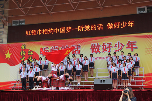 发表时间:2016-10-13 17:25 2016年9月开学季,闽江学院附中合唱团成功纳新。新一批团员40人,具备一定的音乐素养。均是由音乐组全体教师,利用暑期新生报道的最佳时机,面试选拔而出的佼佼者。 音乐组李敏老师在新生军训活动期间,驻扎在福清龙翔社会实践基地,对合唱团员进行为期五天的集训。 10月12日下午,福州市教育系统纪念中国少年先锋队建队67周年活动在闽江学院附中隆重举行,莅临本次活动的领导和来宾有团市委肖善颖副书记、市教育局左秋江副调研员、团市委学少部潘亮部长、市教育局团委郑玲副书记、乐天泉社区郑芬主任,我校俞勇校长、谢海泓书记、陈祁罕副校长、连宇副校长等校领导出席本次活动。各市直学校少先队大队辅导员现场观摩了我校七年级“雷锋大队”建队仪式。音乐组排练一首合唱曲《红领巾心向党》。作为活动开场曲,为本次活动增添光彩。