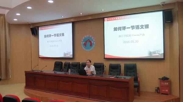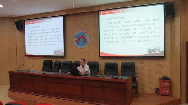发表时间:2016-05-30 18:42 5月30日下午,福州市初一语文教师教研活动在我校举行。我校教务处主任严涛老师为全体岗培教师开设了题为“如何评价一堂语文课”的讲座。 严涛老师认为,听评课是同行互动互助的一种重要研修活动,它集管理调控、诊断指导、鉴定激励、沟通反馈及科研探讨为一体,是研究课堂教学最直接、最具体、最有效的一种方法和手段。同时,他也诚恳地指出,在评课活动中,有的评课者由于或怕尴尬,或怕争论,或怕影响授课者考绩等方面的原因,评课时多了面子上的考量,少了专业上的关怀,以至于出现避实就虚、避重就轻等评课怪象。 严涛老师还认为,评课最重要的是需要一种情怀。这种情怀,就是对执教者的理解,以及与执教者一起对语文课的共同追求,在这种追求中所表现的宽容和扶持。他结合自己的教学实践和工作经验,为岗培教师介绍了评课应遵循的基本原则、基本要求及评课要掌握的方法。并分析了一节好课的标准:一是要能够给学生提供自主探索的空间,创设适合学生发展的宽松的学习氛围。课堂上不能只看到教师的聪明才智,更要看到学生的聪明才智; 二是课堂教学既要关注学生的学习结果,更要关注学生在学习过程中的变化与发展。如学生的参与度、学习的自信心培养、合作交流意识的形成、独立思维习惯的养成等。 本次教研活动由市教研员刘波老师主持,全市各中学近百名语文教师参加了此次培训。严涛老师真诚坦率、风趣幽默、贴近现实、深入浅出的讲座,对增强教师们听评课的意识和提高评课水平起到了很好的引领指导作用。