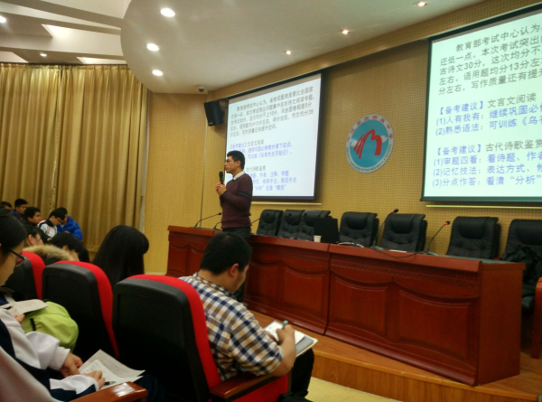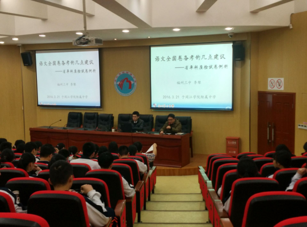 发表时间:2016-03-23 18:50 3月21日,福州三中教务处主任李棽应邀莅临我校为高三同学做高考复习指导。开讲前连宇副校长做了热情的介绍并要求同学们珍惜难得的机会,做好听课笔记。李棽老师以站到主席台前的姿态开始讲座,迅速拉近了和学生的距离。他谦虚而又恳切,娓娓道来语文答卷的时间观念、古诗文阅读及作文题的读题意识和读题路径;他语言温和而有力,学生大有收获。他还为老师同学们留下了宝贵的资料。最后,讲座在热烈的掌声中结束!