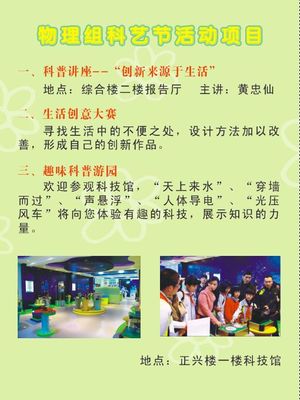 发表时间:2016-01-10 18:55 015年物理组科艺节活动小结 在2016新年来临之际,我校成功举办了以“智慧、创新、幸福、成长”为主题的第十届科技文化艺术节。 我校作为青少年科普教育基地,校内科技馆充当科普教育的主战场。物理组全体教师对每一个仪器写下详细的解说词。并在本次科艺节中为全体师生详细解说每一个仪器的科学原理,充分发挥科技馆的科普作用。进一步增强学校的科技氛围,培养学生探索科学的兴趣和爱好,提高学生的科学素养。 “创新来源于生活”的科普讲座,让学生了解了什么是科技创新,知道创新来源于生活,创新改变了生活,具有了一定的创新意识。“生活创意大赛”为学生提供了参与创新设计的平台,让学生在创新的实践活动中不断提高自身的创新能力。