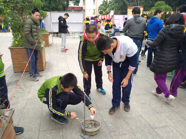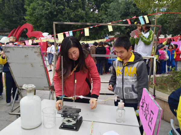 趣味与科学 “化学趣味实验” 向广大师生展示平时接触不到的化学实验,通过讲解普及生活中的化学常识,一方面体现了化学实验的一道亮丽的风景线,另一方面也展现了自然科学的特殊魅力,是化学与科学的完美结果,充分展示了当代中学生的实际动手和操作能力,是对当代中学生全面素质的提高与拓展。铝热反应实验桌前人头攒动,林胜辉教师耐心地讲解实验的要求和安全注意事项,学生点燃镁条插在铝热剂后,引发反应,反应剧烈,火星四射,同时纸漏斗被烧穿,有红色熔融物落在沙子上,甚是精彩。 黄熠老师精心准备的化学趣味谜语为学生提供展示的舞台,提高学生的积极性,既愉悦了身心,又巩固了所学知识。