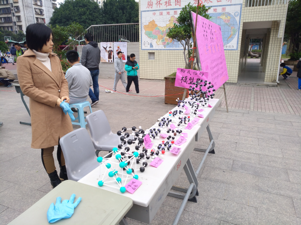 由许东庆老师主导的思维导图设计活动,以“丰富校园文化生活,发掘学生惊人的创造力”为宗旨,学生自由选择所学化学中的任一个知识点、知识块为主题,可集体绘制或个人绘制。希望通过此次活动带给了学生快乐学习的方法,帮助学生提高了学习效率,也激发了同学们的创意想法,发掘了学生们惊人的创造力,丰富了校园文化生活。 物质结构模型展:该活动主要通过由庄敏老师组织学生自己亲手组装分子结构模型,进一步理解结构决定性质的知识,同时也知道物质的多样性,学生搭建的C60的结构模型,令人赞叹不已。学生通过课本或者自行查阅的资料,按照分子的球棍模型或者比例模型,发挥创意,利用身边的材料制作出各种分子模型。通过模型的制作,自发的解决了化学教学的重点和难点,并且提高了动手操作的实践能力和养成了严谨的学习态度。同时一些科学性强、美观的作品可以作为化学教学中的教具,丰富教学资源。