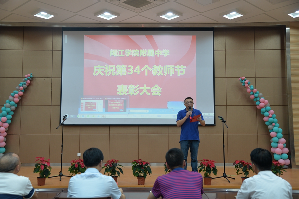 9月10日下午,闽江学院附属中学在正兴楼一楼多功能厅隆重举行庆祝第34个教师节大会暨师德师风教育月活动启动仪式。大会紧紧围绕“弘扬高尚师德 潜心立德树人”主题,内容丰富,形式多样,让全体教职员工切身感受到浓烈节日气氛。福建六建集团党委副书记、工会主席陈友安,水部街道乐天泉社区党委书记叶玲、主任郑芬,学校校级领导及全体教职员工参加了会议。会议由学校办公室副主任杜强主持。