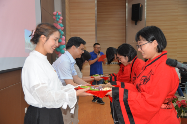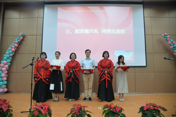 《献束脩六礼,拜授业恩师》 束脩,古代民间上下级、亲戚、朋友之间相互馈赠的一种礼物。古代学生与教师初见面时,必先奉赠礼物,表示敬意,被称为“束脩”。早在孔子的时候已经实行。古代入学拜师时,学生需要提供给学院或者先生的六种带有特殊寓意的礼品。 束脩六礼:肉干(谢师恩),芹菜(业精于勤),龙眼干(启窍生智),莲子(苦心教学),红枣(早日高中),红豆(宏图大展)等组合成的六礼束脩。由团委、少先队选送的六礼束脩节目,让大家重温尊师重教,将这种礼仪在闽院附中继续传承。
