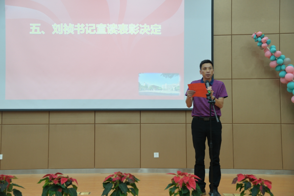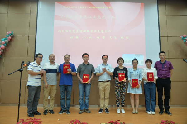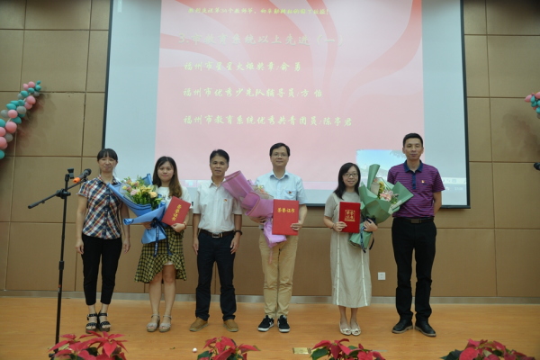 我校党委书记刘祯同志宣读表彰决定:我校获得福建省首届(2015-2017年度)文明校园,福建省义务教育管理标准化学校,福建省第二批义务教育教改示范性建设学校,福州市鼓楼区人民政府颁发“最美庭院”称号,福建省区域全国科技工作者状况调查AA级优秀调查站点,福州市“学无涯”杯青少年儿童动手电子制作锦标赛优秀组织单位,福建省青少年儿童动手电子制作锦标赛体育道德风尚奖,校办公室获福州市总工会“五一先锋号”。陈祁罕副校长获福建省特级教师,陈美婷老师获宁夏海原县支教工作先进个人,俞勇校长获福州市星星火炬奖章,方怡老师获福州市优秀少先队辅导员,陈亭君老师获福州市教育系统优秀共青团员,杜强等5位老师获福州市教育系统网络宣传先进个人,丁琼等30位老师获校先进教育工作者,上官翰明等20位老师获校优秀共产党员,方怡等12位老师获校优秀班主任。