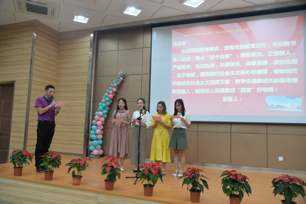 新学年,学校有4名新入职的教师。俞勇校长监誓,刘祯书记领誓,全体教师重温入职誓词:“忠诚党的教育事业,贯彻党的教育方针……”一句句誓言回荡会场,深感作为教师的责任和对教育的忠诚。